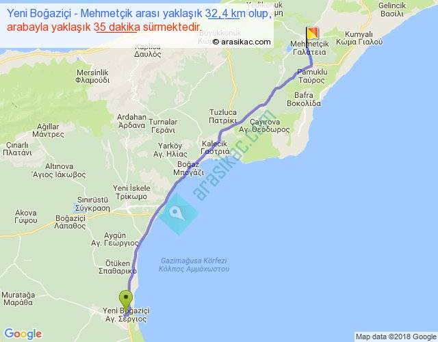 Yeni Boğaziçi - Mehmetçik arası yaklaşık olarak 90 km/h ile yukarıda belirtilen sürede olup, iki yerin kuş uçuşu uzaklığı (mesafesi) 29'dir. Yolculuk otobüsle 45 dakika sürmektedir.