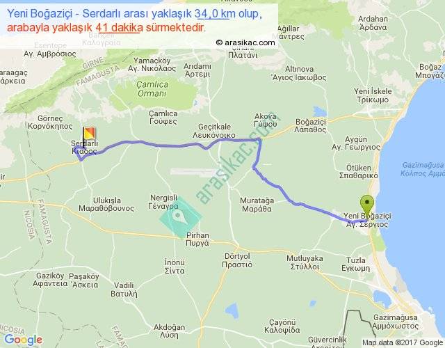 Yeni Boğaziçi - Serdarlı arası yaklaşık olarak 90 km/h ile yukarıda belirtilen sürede olup, iki yerin kuş uçuşu uzaklığı (mesafesi) 26'dir. Yolculuk otobüsle 53 dakika sürmektedir.