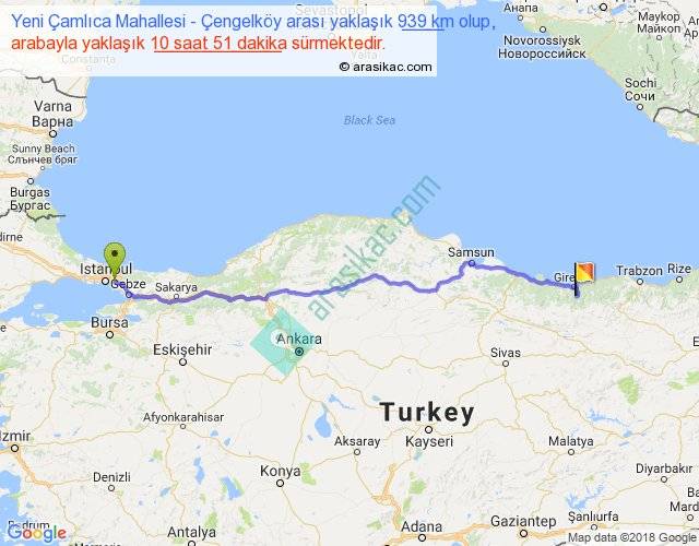 Yeni Çamlıca Mahallesi - Çengelköy arası yaklaşık olarak 90 km/h ile yukarıda belirtilen sürede olup, iki yerin kuş uçuşu uzaklığı (mesafesi) 776'dir. Eğer belirtilen yerler arasında uçak seferi var ise bu süre uçakla 1 saat 11 dakika'ya kadar düşebilir. Yolculuk otobüsle 14 saat 6 dakika sürmektedir.