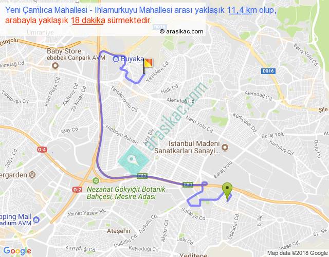 Yeni Çamlıca Mahallesi - Ihlamurkuyu Mahallesi arası yaklaşık olarak 90 km/h ile yukarıda belirtilen sürede olup, iki yerin kuş uçuşu uzaklığı (mesafesi) 4'dir. Yolculuk otobüsle 23 dakika sürmektedir.