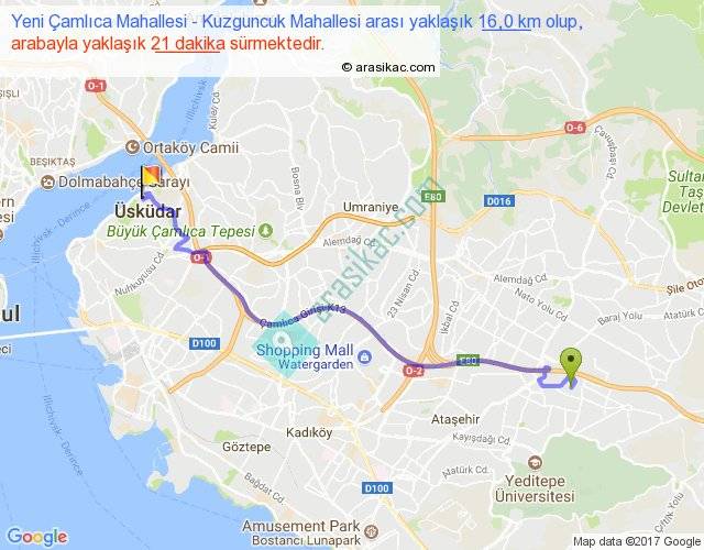 Yeni Çamlıca Mahallesi - Kuzguncuk Mahallesi arası yaklaşık olarak 90 km/h ile yukarıda belirtilen sürede olup, iki yerin kuş uçuşu uzaklığı (mesafesi) 12'dir. Yolculuk otobüsle 27 dakika sürmektedir.
