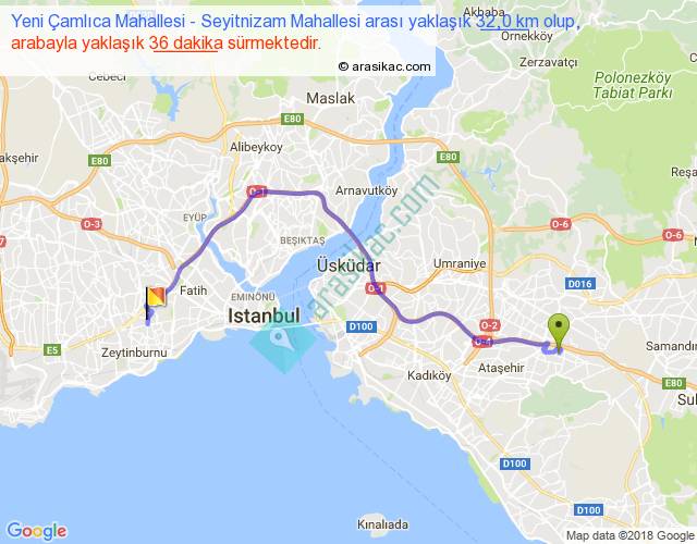 Yeni Çamlıca Mahallesi - Seyitnizam Mahallesi arası yaklaşık olarak 90 km/h ile yukarıda belirtilen sürede olup, iki yerin kuş uçuşu uzaklığı (mesafesi) 22'dir. Yolculuk otobüsle 46 dakika sürmektedir.