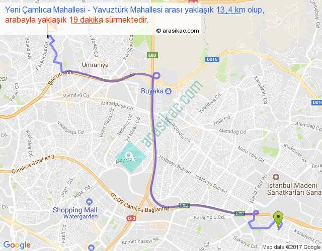 Eğer Yeni Çamlıca Mahallesi Yavuztürk Mahallesi arası ne kadar yakar (benzin/mazot) diyorsanız, kilometrede 3 ₺ yakan bir aracınız var ise 39, km'de 4 ₺ yakan bir aracınız var ise 52, km'de 5 ₺ yakan bir aracınız var ise 65 ile bu yolculuğu tamamlayabilirsiniz.