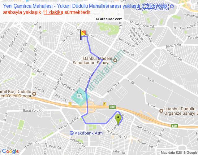 Yeni Çamlıca Mahallesi - Yukarı Dudullu Mahallesi arası yaklaşık olarak 90 km/h ile yukarıda belirtilen sürede olup, iki yerin kuş uçuşu uzaklığı (mesafesi) 2'dir. Yolculuk otobüsle 14 dakika sürmektedir.