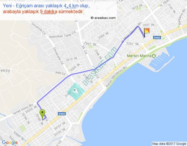 Yeni - Eğriçam arası yaklaşık olarak 90 km/h ile yukarıda belirtilen sürede olup, iki yerin kuş uçuşu uzaklığı (mesafesi) 3'dir. Yolculuk otobüsle 11 dakika sürmektedir.