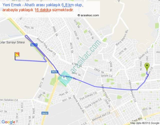 Yeni Emek - Ahatlı arası yaklaşık olarak 90 km/h ile yukarıda belirtilen sürede olup, iki yerin kuş uçuşu uzaklığı (mesafesi) 4'dir. Yolculuk otobüsle 20 dakika sürmektedir.