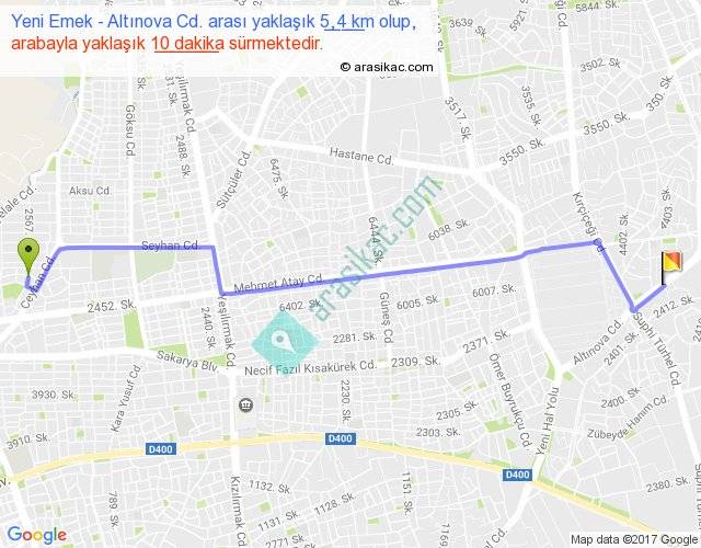Yeni Emek - Altınova Cd. arası yaklaşık olarak 90 km/h ile yukarıda belirtilen sürede olup, iki yerin kuş uçuşu uzaklığı (mesafesi) 4'dir. Yolculuk otobüsle 13 dakika sürmektedir.