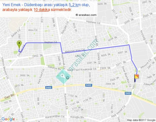 Yeni Emek - Düdenbaşı arası yaklaşık olarak 90 km/h ile yukarıda belirtilen sürede olup, iki yerin kuş uçuşu uzaklığı (mesafesi) 4'dir. Yolculuk otobüsle 13 dakika sürmektedir.