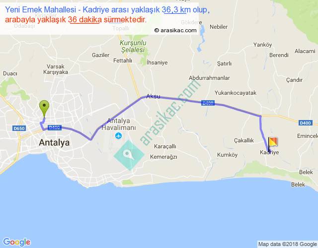 Yeni Emek Mahallesi - Kadriye arası yaklaşık olarak 90 km/h ile yukarıda belirtilen sürede olup, iki yerin kuş uçuşu uzaklığı (mesafesi) 28'dir. Yolculuk otobüsle 46 dakika sürmektedir.