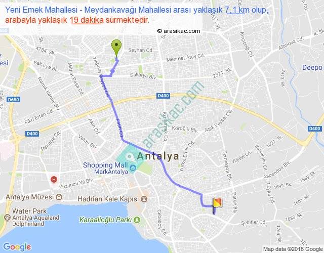 Yeni Emek Mahallesi - Meydankavağı Mahallesi arası yaklaşık olarak 90 km/h ile yukarıda belirtilen sürede olup, iki yerin kuş uçuşu uzaklığı (mesafesi) 6'dir. Yolculuk otobüsle 24 dakika sürmektedir.