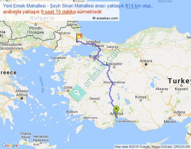 Yeni Emek Mahallesi - Şeyh Sinan Mahallesi arası yaklaşık olarak 90 km/h ile yukarıda belirtilen sürede olup, iki yerin kuş uçuşu uzaklığı (mesafesi) 531'dir. Eğer belirtilen yerler arasında uçak seferi var ise bu süre uçakla 49 dakika'ya kadar düşebilir. Yolculuk otobüsle 12 saat 1 dakika sürmektedir.
