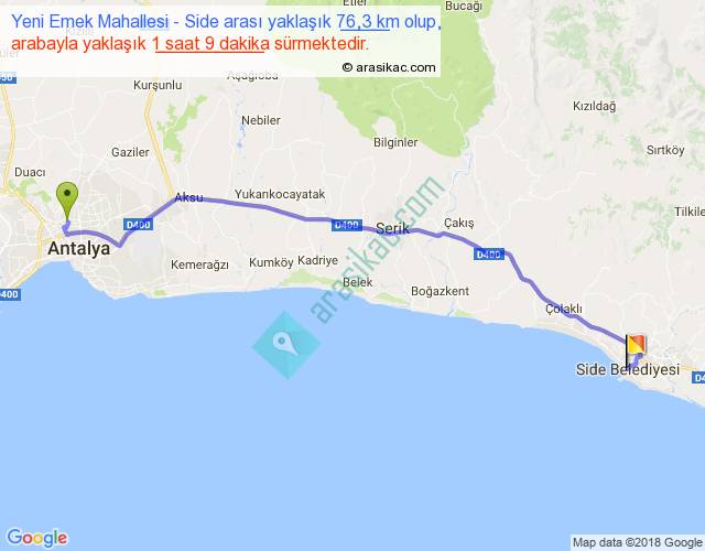 Yeni Emek Mahallesi - Side arası yaklaşık olarak 90 km/h ile yukarıda belirtilen sürede olup, iki yerin kuş uçuşu uzaklığı (mesafesi) 64'dir. Yolculuk otobüsle 1 saat 29 dakika sürmektedir.