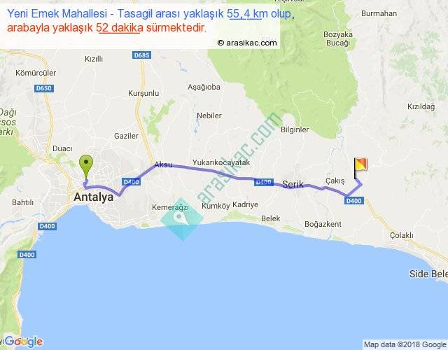 Yeni Emek Mahallesi - Tasagil arası yaklaşık olarak 90 km/h ile yukarıda belirtilen sürede olup, iki yerin kuş uçuşu uzaklığı (mesafesi) 47'dir. Yolculuk otobüsle 1 saat 7 dakika sürmektedir.