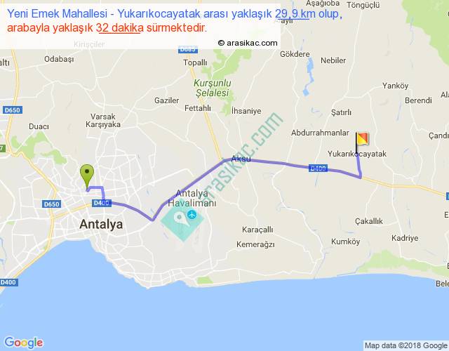 Yeni Emek Mahallesi - Yukarıkocayatak arası yaklaşık olarak 90 km/h ile yukarıda belirtilen sürede olup, iki yerin kuş uçuşu uzaklığı (mesafesi) 24'dir. Yolculuk otobüsle 41 dakika sürmektedir.