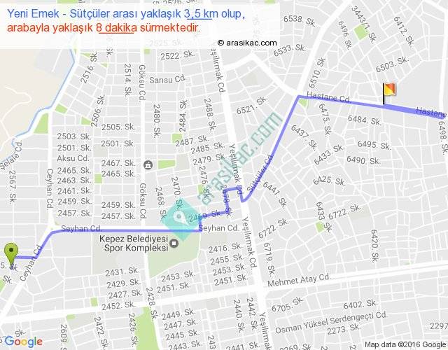 Yeni Emek - Sütçüler arası yaklaşık olarak 90 km/h ile yukarıda belirtilen sürede olup, iki yerin kuş uçuşu uzaklığı (mesafesi) 2'dir. Yolculuk otobüsle 10 dakika sürmektedir.
