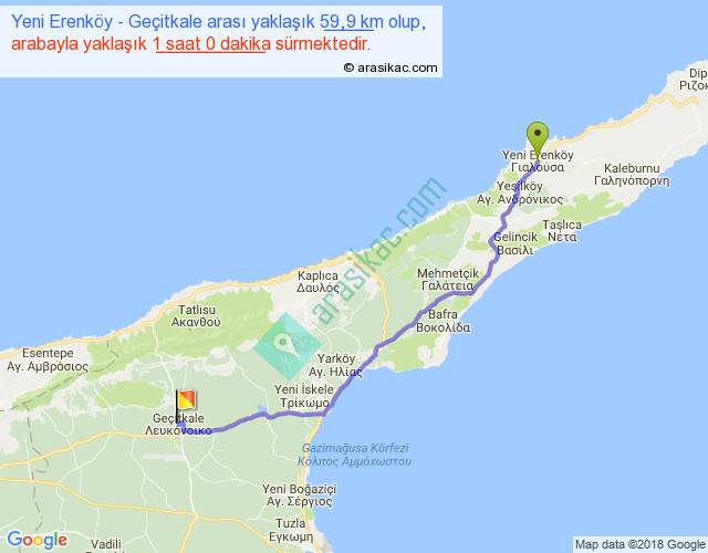 Yeni Erenköy - Geçitkale arası yaklaşık olarak 90 km/h ile yukarıda belirtilen sürede olup, iki yerin kuş uçuşu uzaklığı (mesafesi) 50'dir. Yolculuk otobüsle 1 saat 18 dakika sürmektedir.