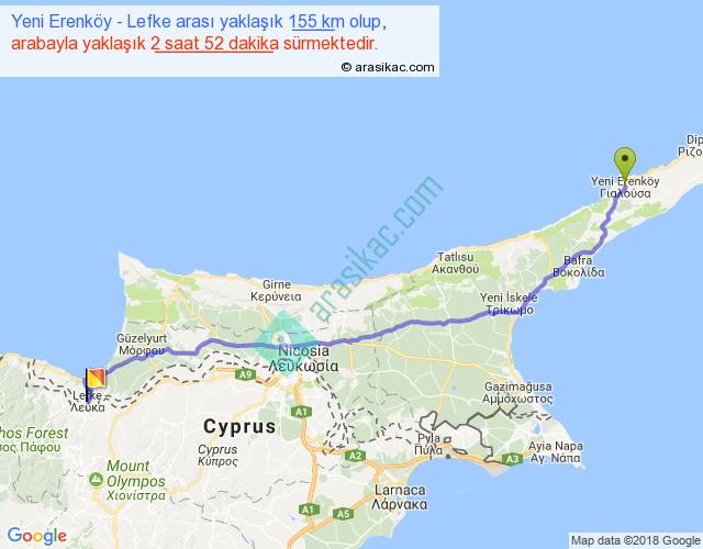 Yeni Erenköy - Lefke arası yaklaşık olarak 90 km/h ile yukarıda belirtilen sürede olup, iki yerin kuş uçuşu uzaklığı (mesafesi) 131'dir. Yolculuk otobüsle 3 saat 43 dakika sürmektedir.