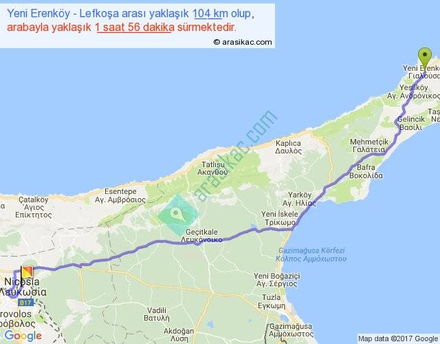Yeni Erenköy - Lefkoşa arası yaklaşık olarak 90 km/h ile yukarıda belirtilen sürede olup, iki yerin kuş uçuşu uzaklığı (mesafesi) 82'dir. Yolculuk otobüsle 2 saat 30 dakika sürmektedir.
