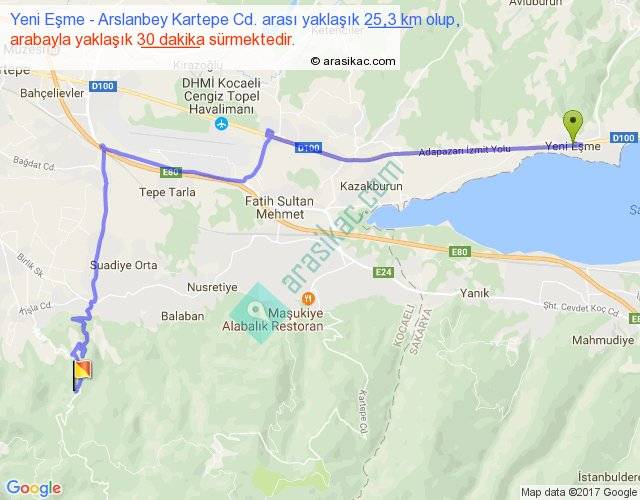 Yeni Eşme - Arslanbey Kartepe Cd. arası yaklaşık olarak 90 km/h ile yukarıda belirtilen sürede olup, iki yerin kuş uçuşu uzaklığı (mesafesi) 16'dir. Yolculuk otobüsle 39 dakika sürmektedir.