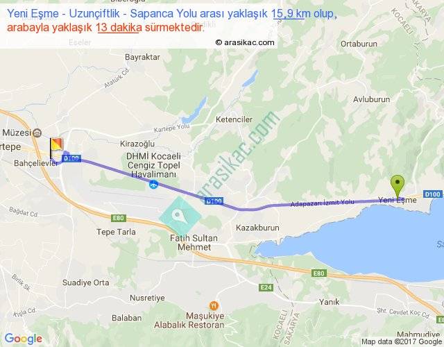 Yeni Eşme - Uzunçiftlik - Sapanca Yolu arası yaklaşık olarak 90 km/h ile yukarıda belirtilen sürede olup, iki yerin kuş uçuşu uzaklığı (mesafesi) 14'dir. Yolculuk otobüsle 16 dakika sürmektedir.