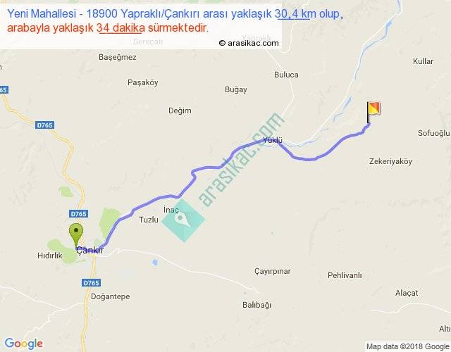Yeni Mahallesi - 18900 Yapraklı Çankırı arası yaklaşık olarak 90 km/h ile yukarıda belirtilen sürede olup, iki yerin kuş uçuşu uzaklığı (mesafesi) 26'dir. Yolculuk otobüsle 44 dakika sürmektedir.