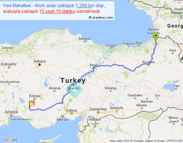 Yeni Mahallesi - Ahırlı arası yaklaşık olarak 90 km/h ile yukarıda belirtilen sürede olup, iki yerin kuş uçuşu uzaklığı (mesafesi) 937'dir. Eğer belirtilen yerler arasında uçak seferi var ise bu süre uçakla 1 saat 26 dakika'ya kadar düşebilir. Yolculuk otobüsle 19 saat 50 dakika sürmektedir.