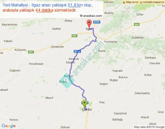 Yeni Mahallesi - Ilgaz arası yaklaşık olarak 90 km/h ile yukarıda belirtilen sürede olup, iki yerin kuş uçuşu uzaklığı (mesafesi) 36'dir. Yolculuk otobüsle 57 dakika sürmektedir.