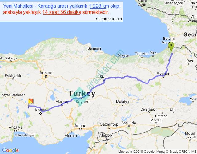 Yeni Mahallesi - Karaağa arası yaklaşık olarak 90 km/h ile yukarıda belirtilen sürede olup, iki yerin kuş uçuşu uzaklığı (mesafesi) 928'dir. Eğer belirtilen yerler arasında uçak seferi var ise bu süre uçakla 1 saat 25 dakika'ya kadar düşebilir. Yolculuk otobüsle 19 saat 24 dakika sürmektedir.