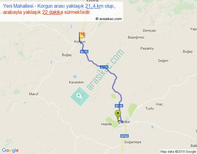Yeni Mahallesi - Korgun arası yaklaşık olarak 90 km/h ile yukarıda belirtilen sürede olup, iki yerin kuş uçuşu uzaklığı (mesafesi) 16'dir. Yolculuk otobüsle 28 dakika sürmektedir.