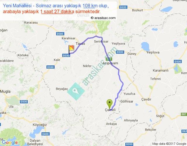 Yeni Mahallesi - Solmaz arası yaklaşık olarak 90 km/h ile yukarıda belirtilen sürede olup, iki yerin kuş uçuşu uzaklığı (mesafesi) 57'dir. Yolculuk otobüsle 1 saat 53 dakika sürmektedir.