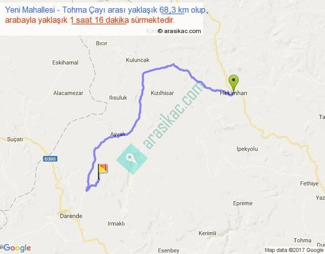 Yeni Mahallesi - Tohma Çayı arası yaklaşık olarak 90 km/h ile yukarıda belirtilen sürede olup, iki yerin kuş uçuşu uzaklığı (mesafesi) 37'dir. Yolculuk otobüsle 1 saat 38 dakika sürmektedir.