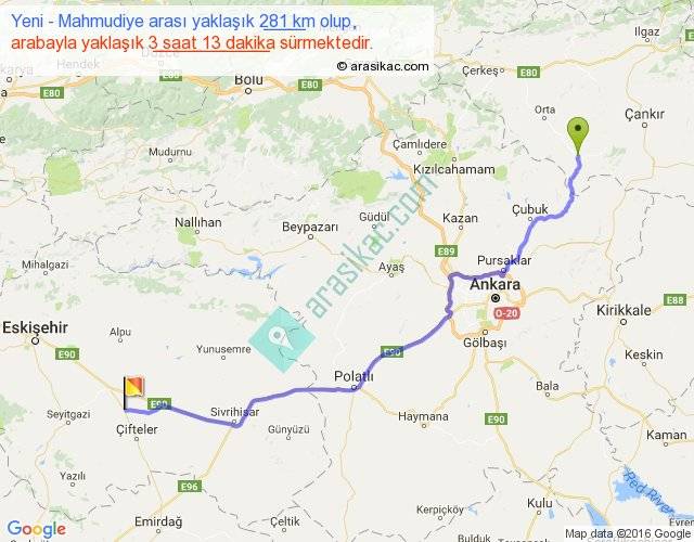 Yeni - Mahmudiye arası yaklaşık olarak 90 km/h ile yukarıda belirtilen sürede olup, iki yerin kuş uçuşu uzaklığı (mesafesi) 223'dir. Yolculuk otobüsle 4 saat 10 dakika sürmektedir.