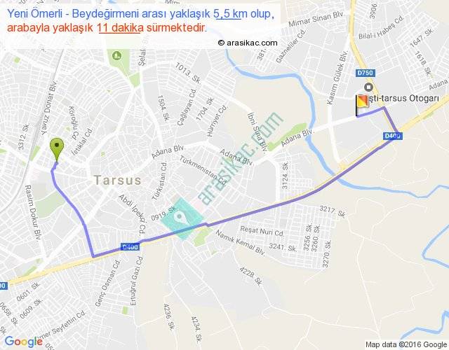Yeni Ömerli - Beydeğirmeni arası yaklaşık olarak 90 km/h ile yukarıda belirtilen sürede olup, iki yerin kuş uçuşu uzaklığı (mesafesi) 3'dir. Yolculuk otobüsle 14 dakika sürmektedir.