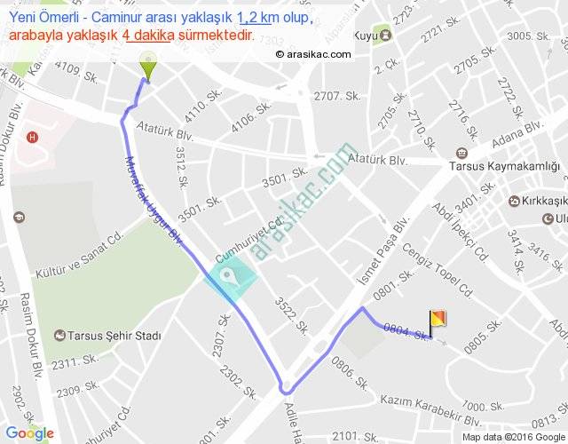Yeni Ömerli - Caminur arası yaklaşık olarak 90 km/h ile yukarıda belirtilen sürede olup, iki yerin kuş uçuşu uzaklığı (mesafesi) 1'dir. Yolculuk otobüsle 5 dakika sürmektedir.