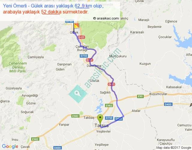Yeni Ömerli - Gülek arası yaklaşık olarak 90 km/h ile yukarıda belirtilen sürede olup, iki yerin kuş uçuşu uzaklığı (mesafesi) 39'dir. Yolculuk otobüsle 1 saat 7 dakika sürmektedir.