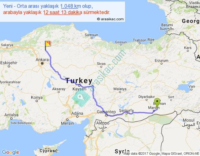 Yeni - Orta arası yaklaşık olarak 90 km/h ile yukarıda belirtilen sürede olup, iki yerin kuş uçuşu uzaklığı (mesafesi) 762'dir. Eğer belirtilen yerler arasında uçak seferi var ise bu süre uçakla 1 saat 10 dakika'ya kadar düşebilir. Yolculuk otobüsle 15 saat 52 dakika sürmektedir.