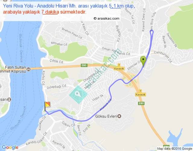 Yeni Riva Yolu - Anadolu Hisarı Mh. arası yaklaşık olarak 90 km/h ile yukarıda belirtilen sürede olup, iki yerin kuş uçuşu uzaklığı (mesafesi) 3'dir. Yolculuk otobüsle 9 dakika sürmektedir.