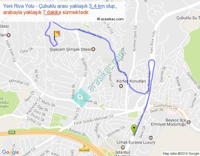 Yeni Riva Yolu - Çubuklu arası yaklaşık olarak 90 km/h ile yukarıda belirtilen sürede olup, iki yerin kuş uçuşu uzaklığı (mesafesi) 1'dir. Yolculuk otobüsle 9 dakika sürmektedir.
