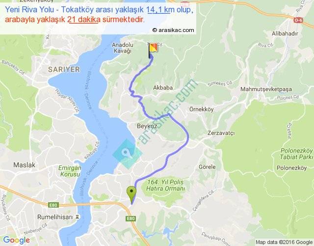 Yeni Riva Yolu - Tokatköy arası yaklaşık olarak 90 km/h ile yukarıda belirtilen sürede olup, iki yerin kuş uçuşu uzaklığı (mesafesi) 9'dir. Yolculuk otobüsle 27 dakika sürmektedir.