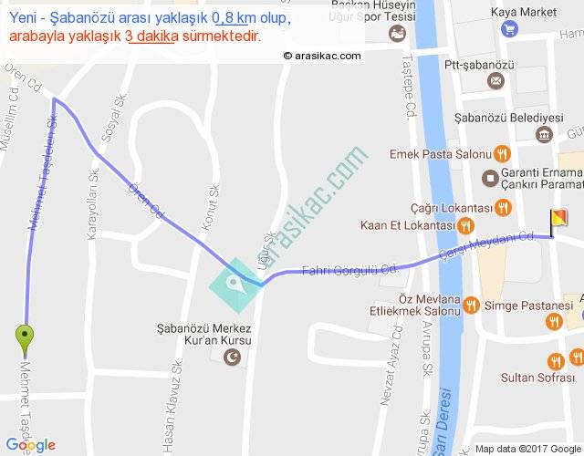 Yeni - Şabanözü arası yaklaşık olarak 90 km/h ile yukarıda belirtilen sürede olup, iki yerin kuş uçuşu uzaklığı (mesafesi) 1'dir. Yolculuk otobüsle 3 dakika sürmektedir.