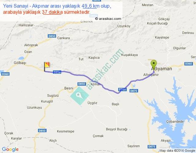 Yeni Sanayi - Akpınar arası yaklaşık olarak 90 km/h ile yukarıda belirtilen sürede olup, iki yerin kuş uçuşu uzaklığı (mesafesi) 43'dir. Yolculuk otobüsle 48 dakika sürmektedir.