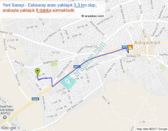 Yeni Sanayi - Eskisaray arası yaklaşık olarak 90 km/h ile yukarıda belirtilen sürede olup, iki yerin kuş uçuşu uzaklığı (mesafesi) 3'dir. Yolculuk otobüsle 10 dakika sürmektedir.