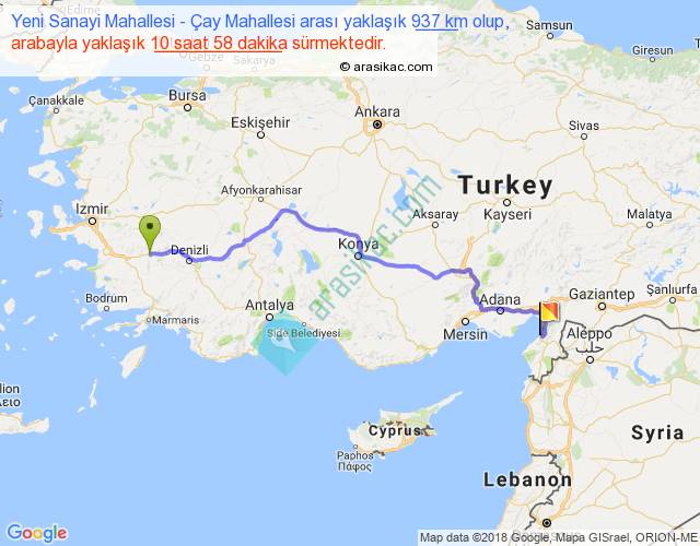 Yeni Sanayi Mahallesi - Çay Mahallesi arası yaklaşık olarak 90 km/h ile yukarıda belirtilen sürede olup, iki yerin kuş uçuşu uzaklığı (mesafesi) 707'dir. Eğer belirtilen yerler arasında uçak seferi var ise bu süre uçakla 1 saat 05 dakika'ya kadar düşebilir. Yolculuk otobüsle 14 saat 15 dakika sürmektedir.