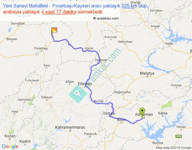 Yeni Sanayi Mahallesi - Pınarbaşı Kayseri arası yaklaşık olarak 90 km/h ile yukarıda belirtilen sürede olup, iki yerin kuş uçuşu uzaklığı (mesafesi) 193'dir. Yolculuk otobüsle 5 saat 34 dakika sürmektedir.