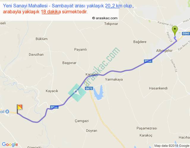 Yeni Sanayi Mahallesi - Sambayat arası yaklaşık olarak 90 km/h ile yukarıda belirtilen sürede olup, iki yerin kuş uçuşu uzaklığı (mesafesi) 18'dir. Yolculuk otobüsle 23 dakika sürmektedir.