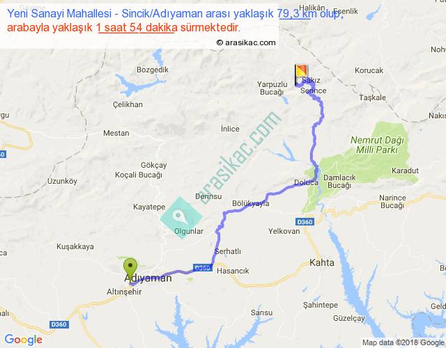 Yeni Sanayi Mahallesi - Sincik Adıyaman arası yaklaşık olarak 90 km/h ile yukarıda belirtilen sürede olup, iki yerin kuş uçuşu uzaklığı (mesafesi) 44'dir. Yolculuk otobüsle 2 saat 28 dakika sürmektedir.