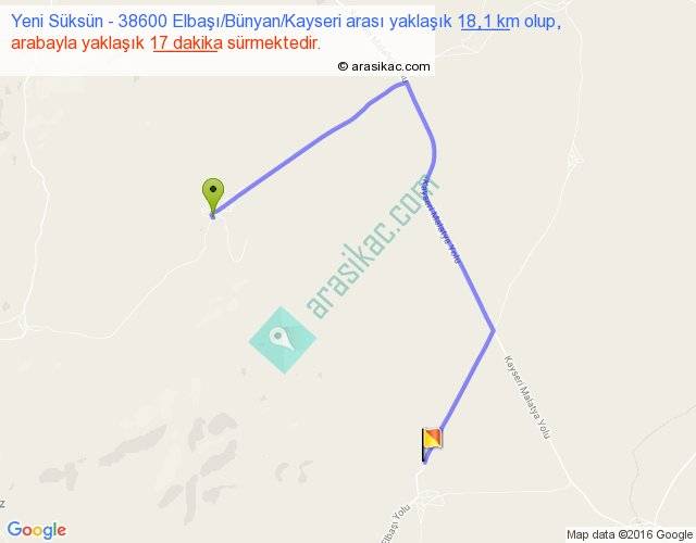 Yeni Süksün - 38600 Elbaşı Bünyan Kayseri arası yaklaşık olarak 90 km/h ile yukarıda belirtilen sürede olup, iki yerin kuş uçuşu uzaklığı (mesafesi) 9'dir. Yolculuk otobüsle 22 dakika sürmektedir.