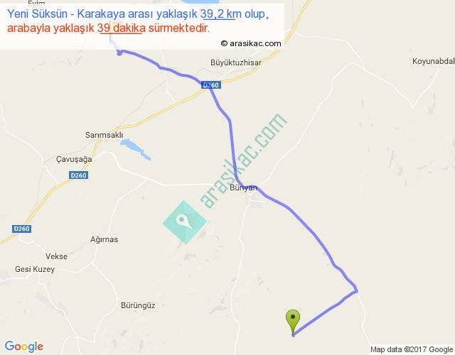 Yeni Süksün - Karakaya arası yaklaşık olarak 90 km/h ile yukarıda belirtilen sürede olup, iki yerin kuş uçuşu uzaklığı (mesafesi) 29'dir. Yolculuk otobüsle 50 dakika sürmektedir.