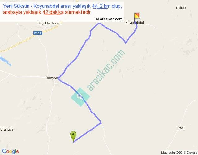 Yeni Süksün - Koyunabdal arası yaklaşık olarak 90 km/h ile yukarıda belirtilen sürede olup, iki yerin kuş uçuşu uzaklığı (mesafesi) 26'dir. Yolculuk otobüsle 54 dakika sürmektedir.