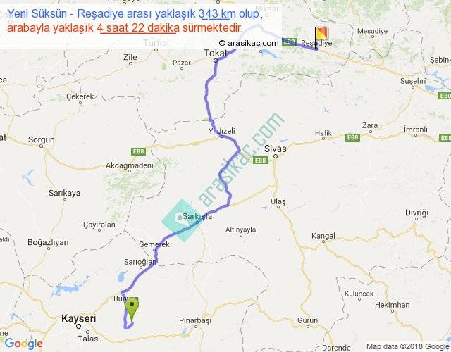 Yeni Süksün - Reşadiye arası yaklaşık olarak 90 km/h ile yukarıda belirtilen sürede olup, iki yerin kuş uçuşu uzaklığı (mesafesi) 220'dir. Yolculuk otobüsle 5 saat 40 dakika sürmektedir.